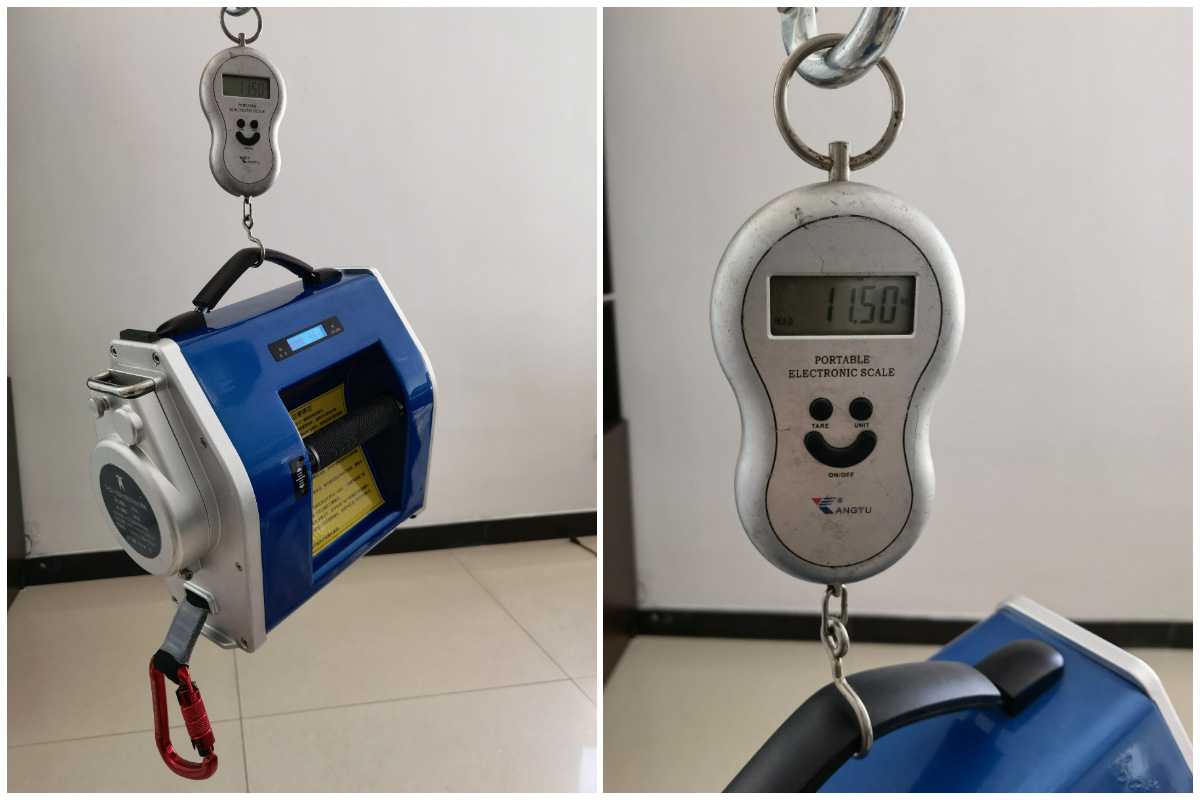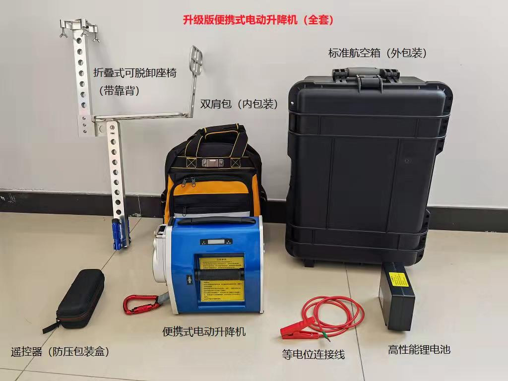 自帶鋰電池重11.5公斤,一塊鋰電池常溫下負載120公斤上下運行大于700米。(其中鋰電池1.65公斤)